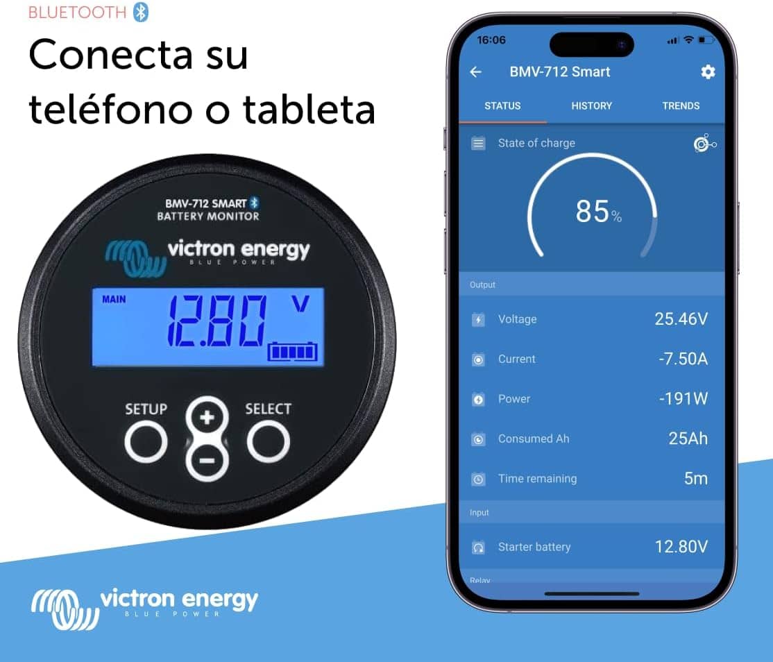 Die Überwachung dieses Wertes ist bei großen Batteriebänken von großem Interesse, aber normalerweise mit hohen Kosten verbunden. Mit dem schwarzen Victron BMV-712 Smart Batteriemonitor ist es jedoch möglich, diesen Parameter einfach und viel kostengünstiger zu überwachen.