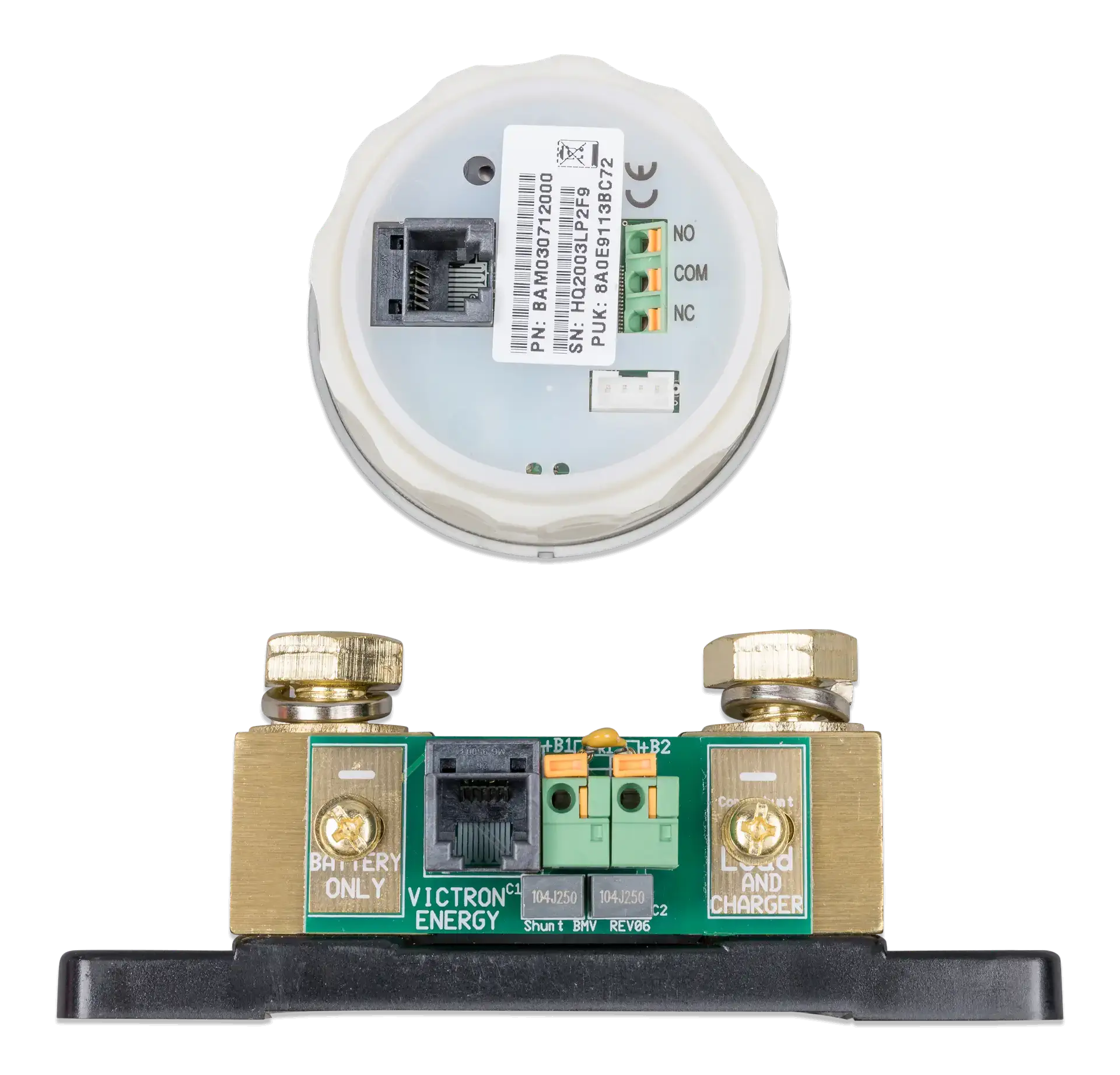 Alle elektrischen Anschlüsse werden an der Schnellanschlussplatine des Shunts vorgenommen. Der Shunt wird über ein Standard-RJ12-Telefonkabel, das im Lieferumfang enthalten ist, an den Monitor angeschlossen. Ein abgesichertes Batteriekabel (2 m) ist ebenfalls enthalten. Eine weitere Installation ist nicht erforderlich.