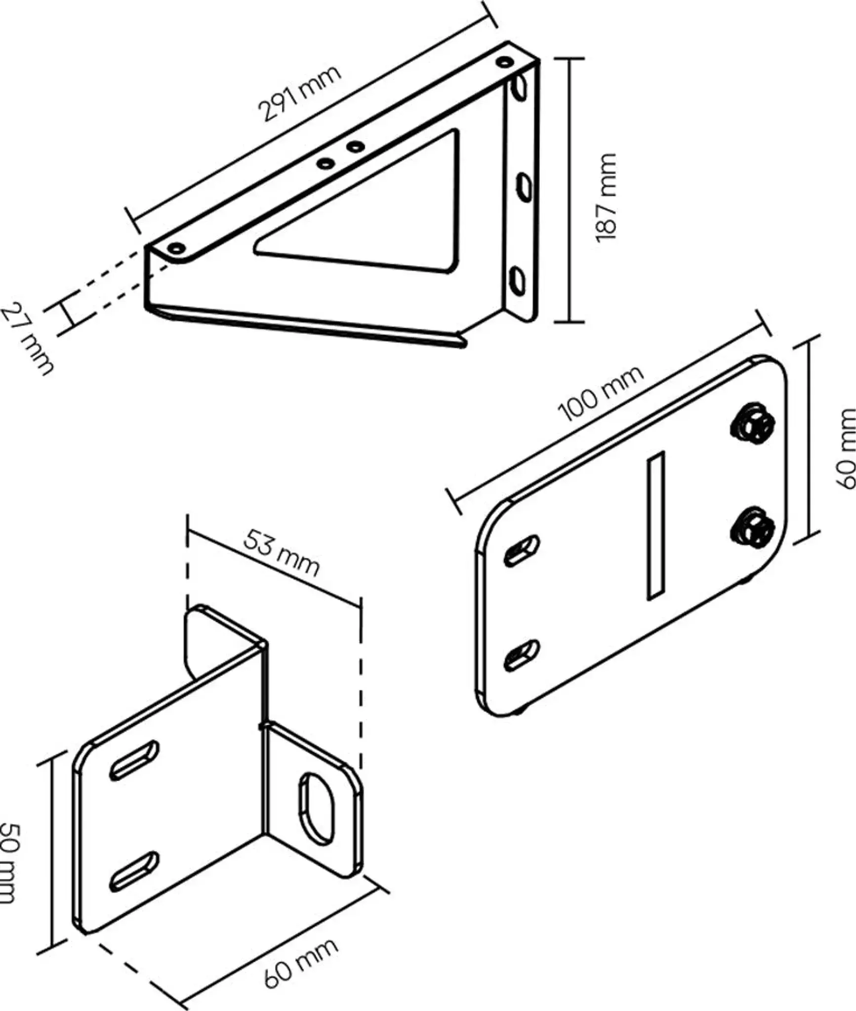 | Abmessungen - obere Halterungen (B × H × T) | 291 × 187 × 27 mm |