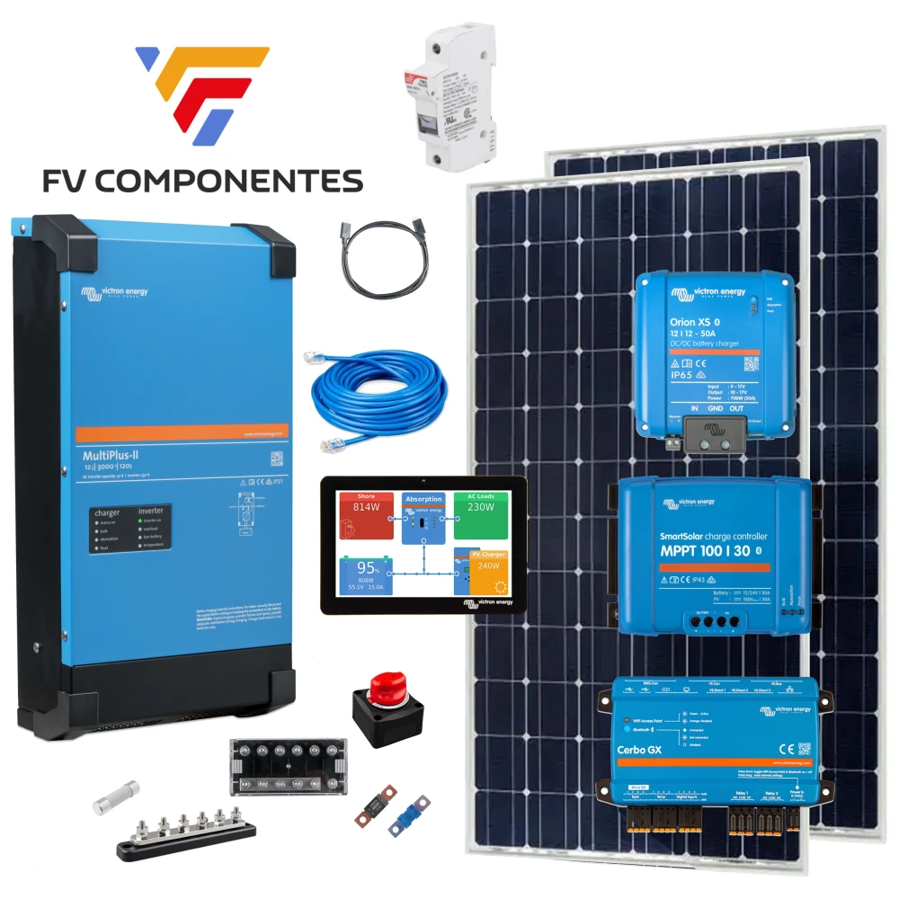 Wechselrichter und Batterieladegerät Victron Multiplus II 12V und 3000w, mit dem Sie alle elektrischen Geräte, die Sie in Ihrem Van oder Wohnwagen haben, mit Strom versorgen können. Da es sich um ein Ladegerät handelt, können Sie es auch auf einem Campingplatz oder in einer Garage anschließen, um die Lithiumbatterie maximal aufzuladen.