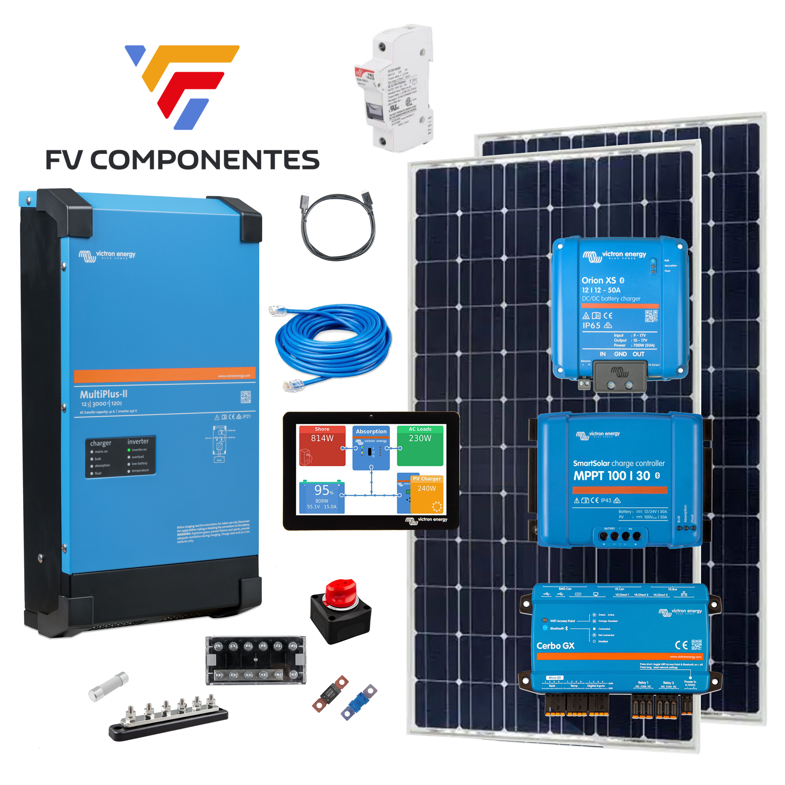 Wechselrichter und Batterieladegerät Victron Multiplus II 12V und 3000w, mit dem Sie alle elektrischen Geräte, die Sie in Ihrem Van oder Wohnwagen haben, mit Strom versorgen können. Da es sich um ein Ladegerät handelt, können Sie es auch auf einem Campingplatz oder in einer Garage anschließen, um die Lithiumbatterie maximal aufzuladen.