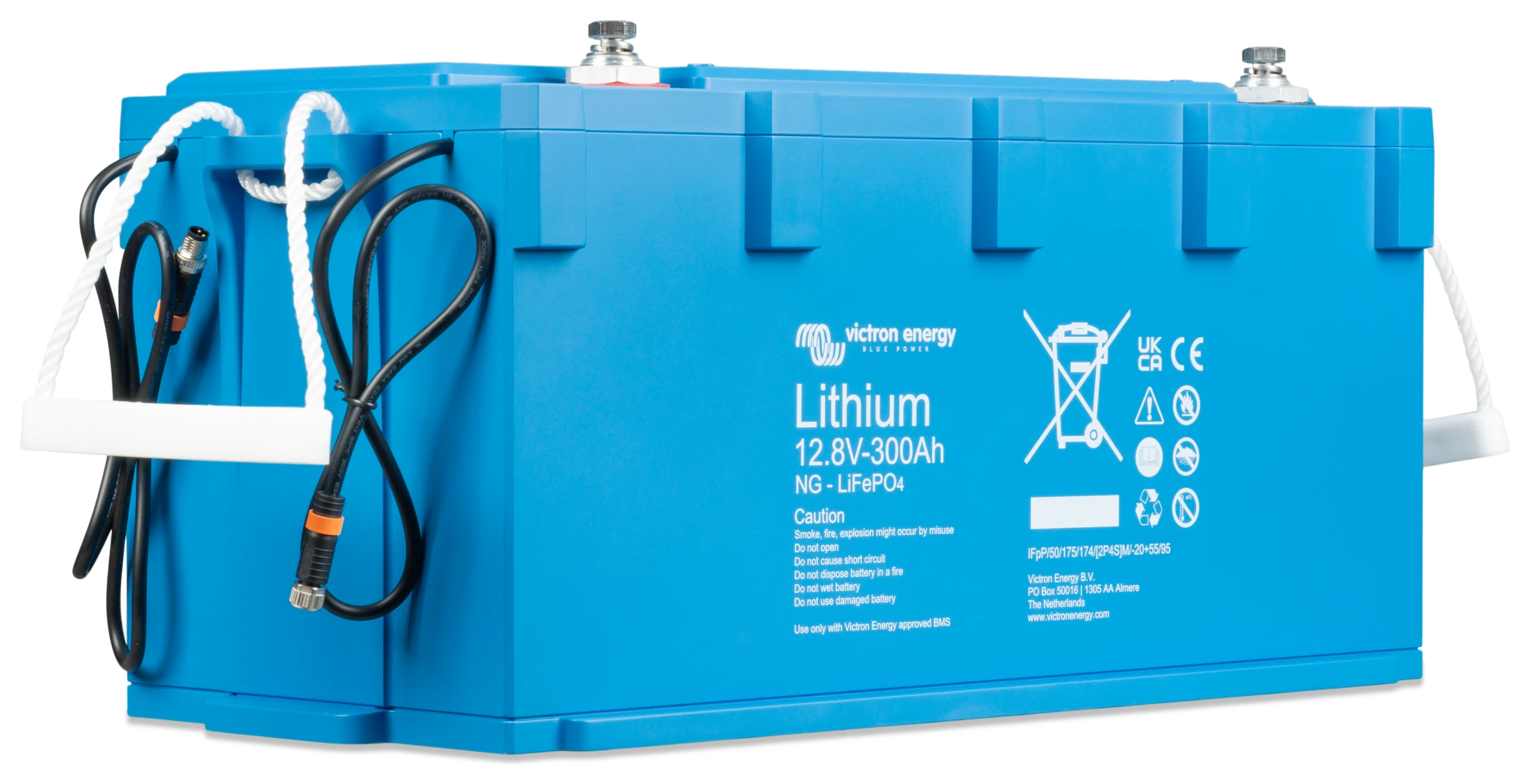 The Victron LiFePO4 12,8V 300Ah NG lithium battery is a lithium iron phosphate battery, has an IP65 protection rating and has an integrated shunt. It can be connected in parallel, in series or in series/parallel combination. A maximum of 50 batteries can be connected per BMS NG; the maximum energy storage of a system consisting of 50 300Ah batteries is 192kWh.