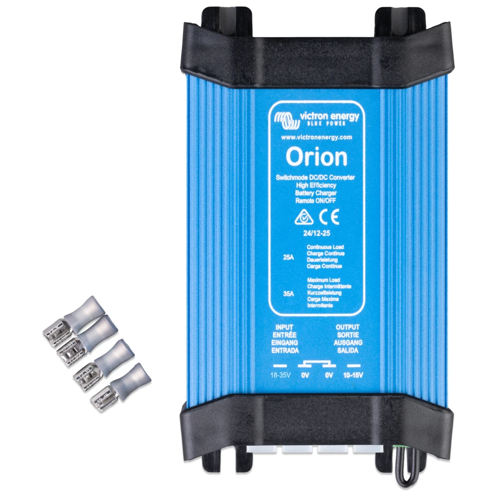 El Orion 24/12-30 es un dispositivo compacto y robusto diseñado para transformar la corriente continua (CC) de un sistema de 24 V a uno de 12 V de forma estable y eficiente, con una corriente de salida de hasta 30 A.