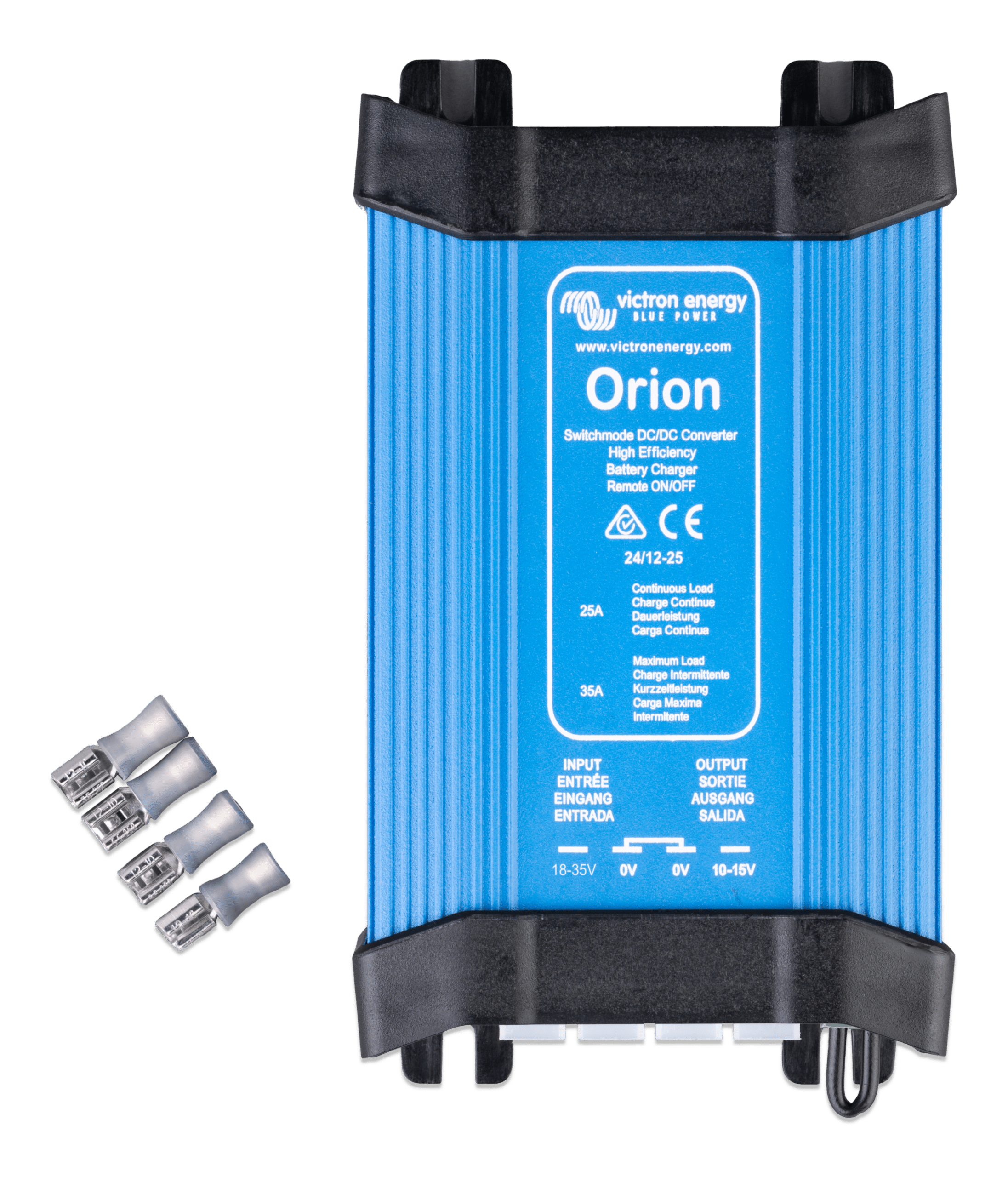 Además, el Orion 24/12-30 tiene una eficiencia de un 96%, por lo que casi toda la corriente de 24 V que le entra, sale a 12 V sin tener una perdida significativa de energía.