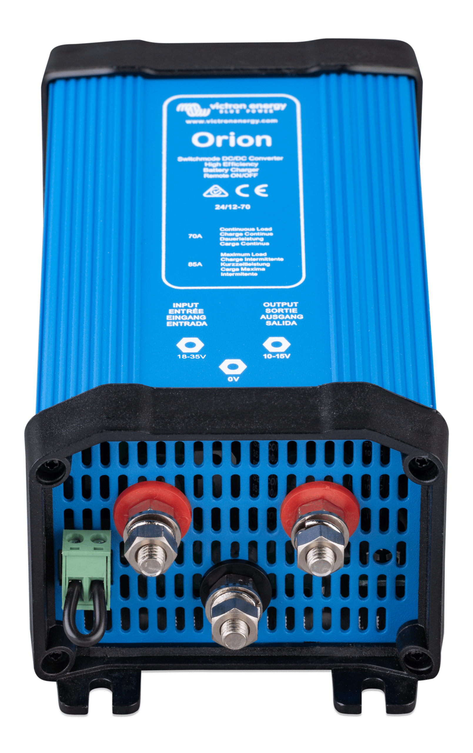 El Orion 24/12-80 es un convertidor DC-DC de alta potencia diseñado para transformar corriente continua (CC) de un sistema de 24 V a uno de 12 V de forma estable y eficiente, proporcionando una corriente de salida de hasta 80 amperios.