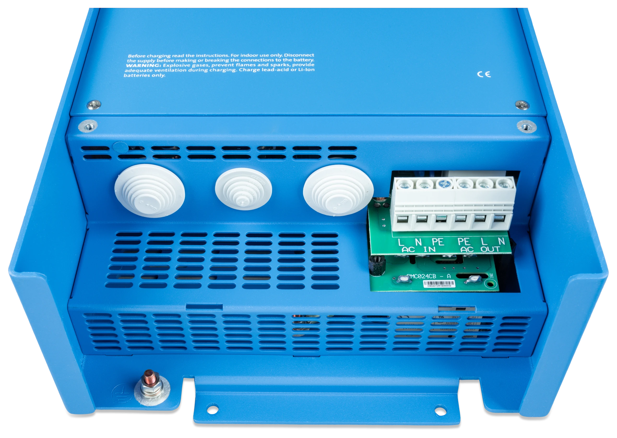 A saída principal fornece uma carga potente ao sistema de baterias através de um software avançado de "carga variável". O software afina o processo automático de três fases para se adequar às condições da bateria e adiciona uma quarta fase para períodos prolongados de flutuação. Para além disso, o MultiPlus pode carregar uma segunda bateria utilizando uma saída de carga limitada separada, concebida para carregar uma bateria de arranque a partir do motor principal ou do gerador.